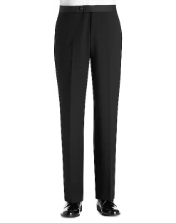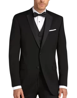 A grosgrain-faced lapel enhances the refined style of this all-black formalwear staple. Flat-front trousers feature a grosgrain stripe down the leg adding polish to the timeless look.