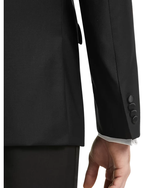 This stylish Calvin Klein tuxedo bundle features a standou tailored jacket in fine 100% natural stretch wool with smooth satin shawl collar, satin-covered buttons and satin trim at the pockets. The fine formal slacks feature a satin stripe detail and a smooth flat front.
