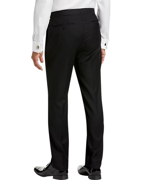 Create your ideal formal-wear look with the addition of these black tuxedo slacks. These fine formal slacks feature a satin stripe detail and a smooth flat front.