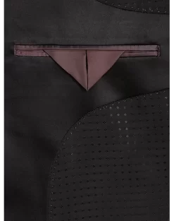 Create your own formal look with flair. This fine dinner jacket features a deep ruby red hue with a black floral pattern accented with a satin lapel and details throughout.