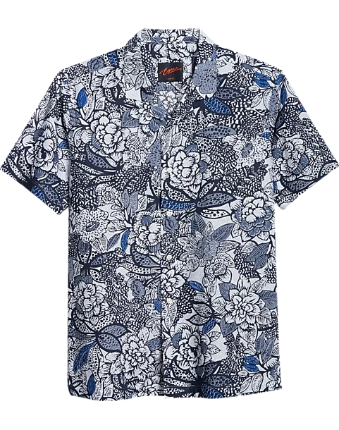 Crafted in batik fashion into a tropical floral design, this short-sleeved sport shirt by Egara offers a vacation-ready vibe. Woven from a cool cotton blend into trim, Slim Fit, it is both dress casual and on-trend.