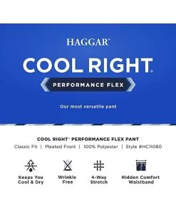 - 100% Polyester|Cool Right®|technology wicks moisture and keeps you dry|4-way stretch|Pleated Front|Pre-hemmed|Classic Fit|Haggar|