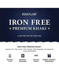 A revolutionary casual pant that checks all the boxes of comfort and style. Fabric blend includes 59% Cotton, 39% Polyester, 2% Elastane for stretch and recovery. The Haggar Iron Free Premium Pant features a permanent center crease, off seam front pockets and single welt back pockets. The flat front, classic fit silhouette offers a hidden expandable waistband to provide the ultimate comfort.