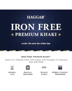 - 59% cotton 39% polyester 2% elastane|Non-iron|Stretch fabric|Hidden expandable waistband|Pleated front|Classic Fit|Haggar|