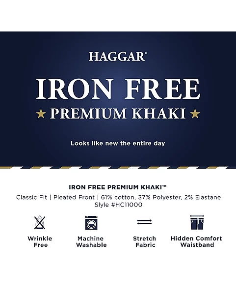 - 59% cotton 39% polyester 2% elastane|Non-iron|Stretch fabric|Hidden expandable waistband|Pleated front|Classic Fit|Haggar|