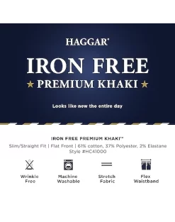- 61% cotton 37% polyester 2% elastane|Non-iron|Wrinkle-free|Comfort-stretch fabric|Shirt gripper for a neat look|Flat front|Straight leg|Classic Fit|Haggar Premium|