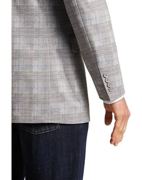 In a striking gray plaid, this sport coat is both stylish and comfortable with its easy-going, soft construction. It features a notch lapel, two-button closure, flap pockets and side vents. 3/8 lined.