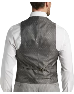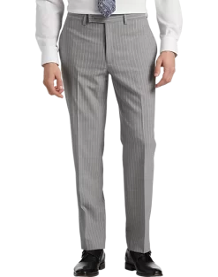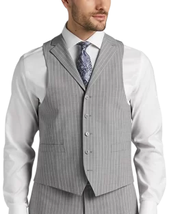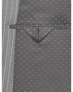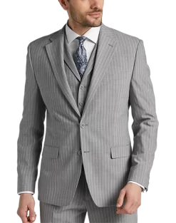 In a Classic Fit this fine suit from Michael Strahan features a traditional gray stripe. A notch lapel coat flat-front slacks and a five-button vest complete this versatile look.