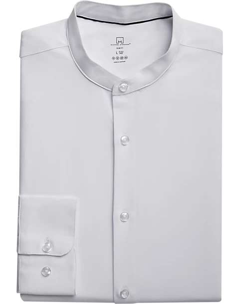 Always a modern look, this banded collar shirt is a smooth and chic alternative to your typical dress shirt. Woven in a cool performance blend fabric, it keeps you comfortable while looking your very best. Slim Fit is slim and tapered across the chest, shoulders, armholes, waist and sleeves without compromising on comfort. Recommended for more triangle body types (broad shoulder and chest, narrow waist and hips).