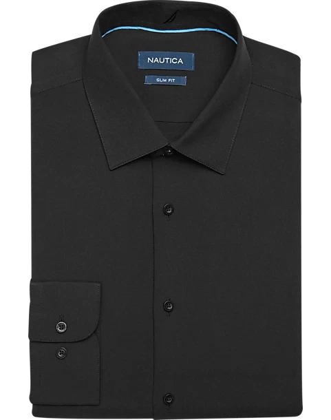 - Wrinkle resistant|Polyester blend|Spread collar|No pockets|Four-way stretch|Slim Fit|Nautica|