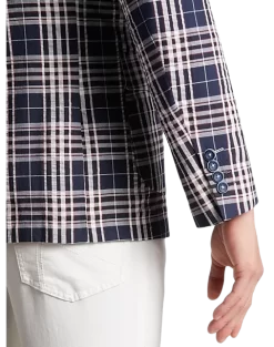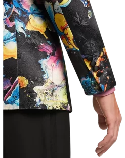 Make a bold, avant-garde statement with this finely crafted dinner jacket by Paisley & Gray. Featuring bright, colorful swirling patterns of art paired with a black satin peak lapel, it is tailored with a Slim Fit to offer a sleek, modern look for your next special occasion.