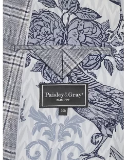 - 74% polyester 24% rayon 2% spandex|Two button|Peak lapel|Side vents|Ticket pocket|Coordinating pieces sold separately|Slim Fit|Paisley & Gray|