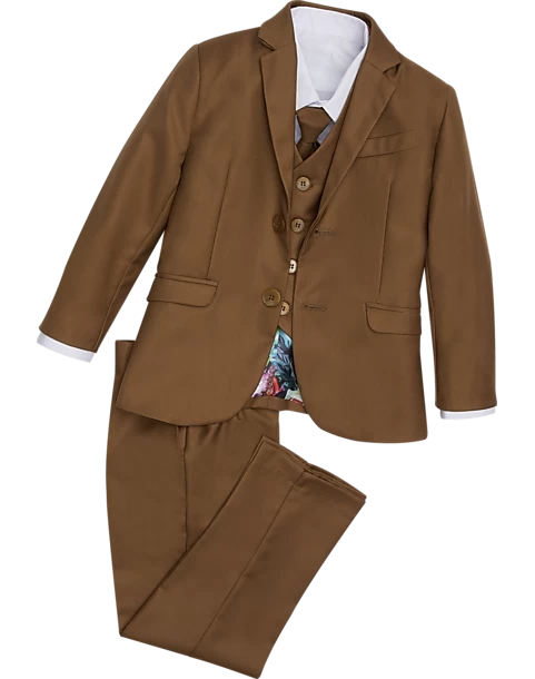 - notch lapel tuxedo coat with contrast lining|Four-button vest|Flat-front pull-up slacks|White dress shirt|Pre-tied tie|Slim Fit|Peanut Butter Collection|