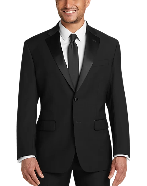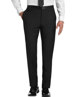 A satin notch lapel brings a refined note to this all-black formal wear staple. Flat-front trousers feature a satin waistband and stripe down the leg, adding polish to the timeless look.