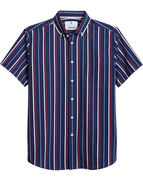 Woven with comfortable four-way stretch fabric, this sport shirt from the Report Collection keeps up with your every move while retaining its shape for the perfect fit. Fashioned with short sleeves and a multicolored stripes, it is both breathable and stylish.