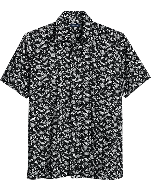 In black with an abstract pattern of florals and palms, this woven cotton camp shirt is as stylish as it is comfortable. Enjoy this short sleeve shirt with shorts, denim or chinos.